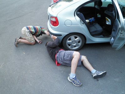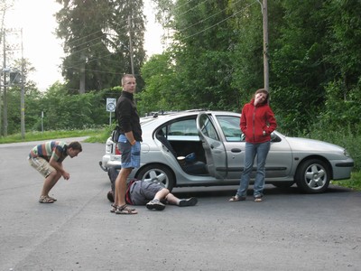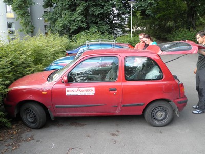 , Pyžiho půjčeného to auta z půjčovny Rent a Wreck. Vyprázdněný kufr a jen 3 lidi v autě udělají divy. Rachot už není tolik slyšet. Náš plán zítra vyjet na sever celý padá. V Oslu budeme muset zůstat ještě minimálně jeden den. Ne-li měsíc a domů letět J Mirův velikášský plán tlumič podomácku jen svařit majitel auta odmítá. V silu si dáme pivo a uvaříme si gulášek. Ať nám to zvedne náladu.