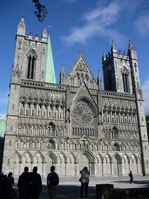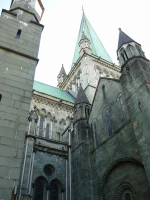 Nikam nespěcháme takže často zastavujeme. V Trondheimu jsme dost pozdě. V 5. Po počátečních machinacích s parkovacími listky jdeme do centra. Parkování je o víkendu odpoledne zdarma, ale lístek musíme mít, ale automat nám žádný nechce dát. Oktaviáni hodí do automatu 1 nok a vypadne jim lístek zdarma. Divný systém. My dostaneme parkovací lístek od nějaké slečny, které jsme se ptali na to jak dostat lístek na parkování z automatu (bylo to tam popsané jenom norsky). Projdeme si město. Katedrála Nidaros