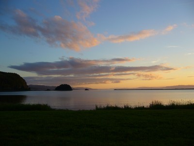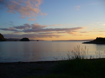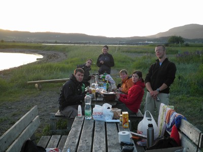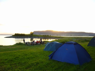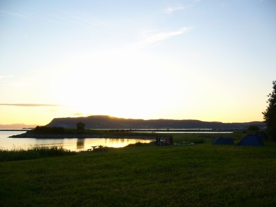 Hned vedle je městečko Hell. Peklo. Tedy aspoň v angličtině, v norštině to znamená něco jako štěstí. Najdeme si místo ke kempování u vody, na posekaném trávníčku. Rozestavíme stany a Mira nahodí udici. Zase nemá štěstí, rybky nikde. Zjišťujeme že je půl dvanácté, na nebi jsou krásné červánky
