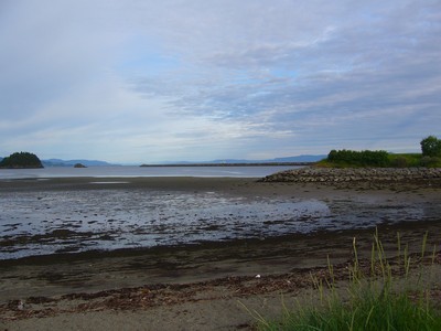 , uprostřed maličký zalesněný ostrůvek. Vpravo dlouhý násep, vlevo výběžek do moře a dřevěný domek na jeho konci. Moc klidu tu ale není, JP s obavami sleduje startující letadla. Jsme kousek od letiště. Bojí se čím poletí zítra do Osla. Na našem kempingu vládla pohoda