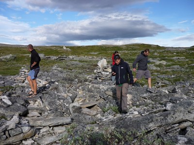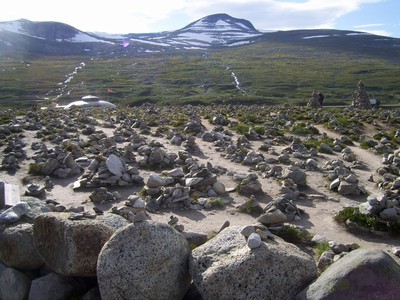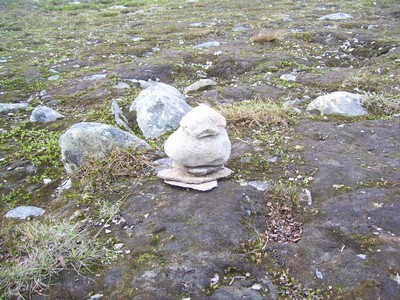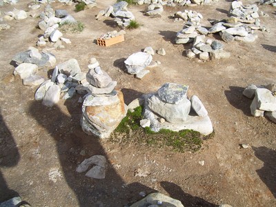 a na vrcholku kousek nad námi zbytky sněhu. Kousek u budovy Centra na kopci bylo pole kamínkových mužů