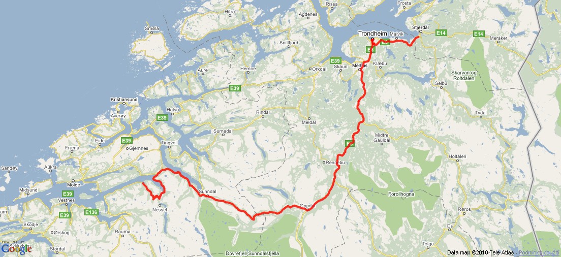 Cesta z trolích končin na Trondheim a nakonec do vesničky Hell, kde jsme zakempili na místní pláži.