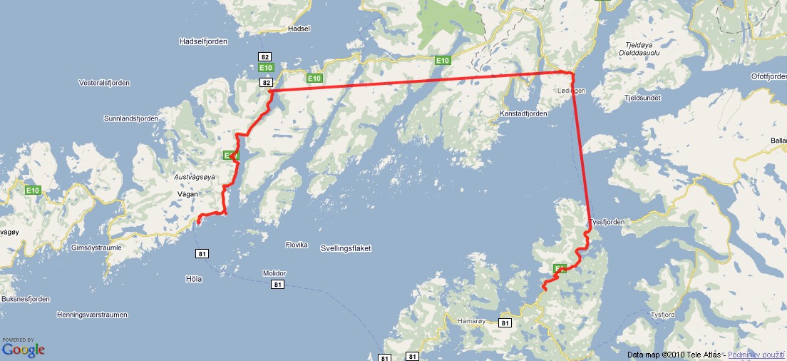 Příjezd trajektem na Lofoty a první den cesty na (polo)ostrovech.