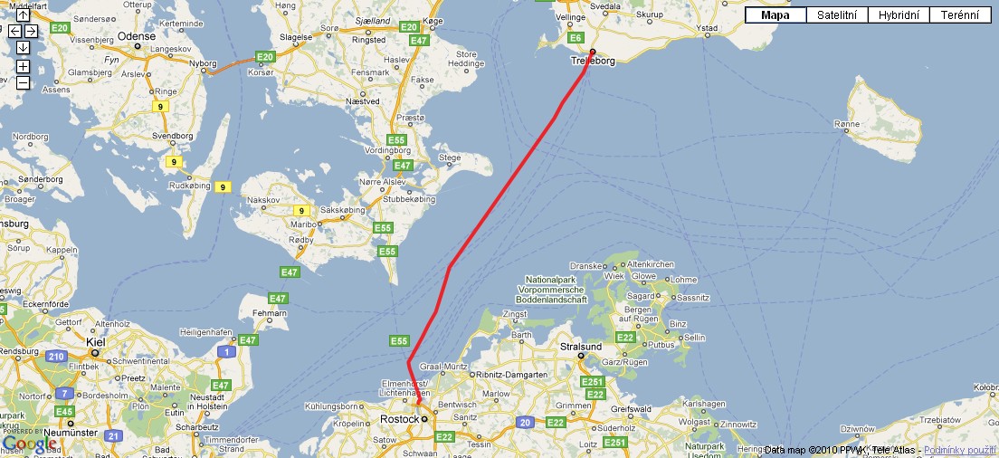 Plavba trajektem z Treleeborgu (SWE) do Rostocku (GER).
